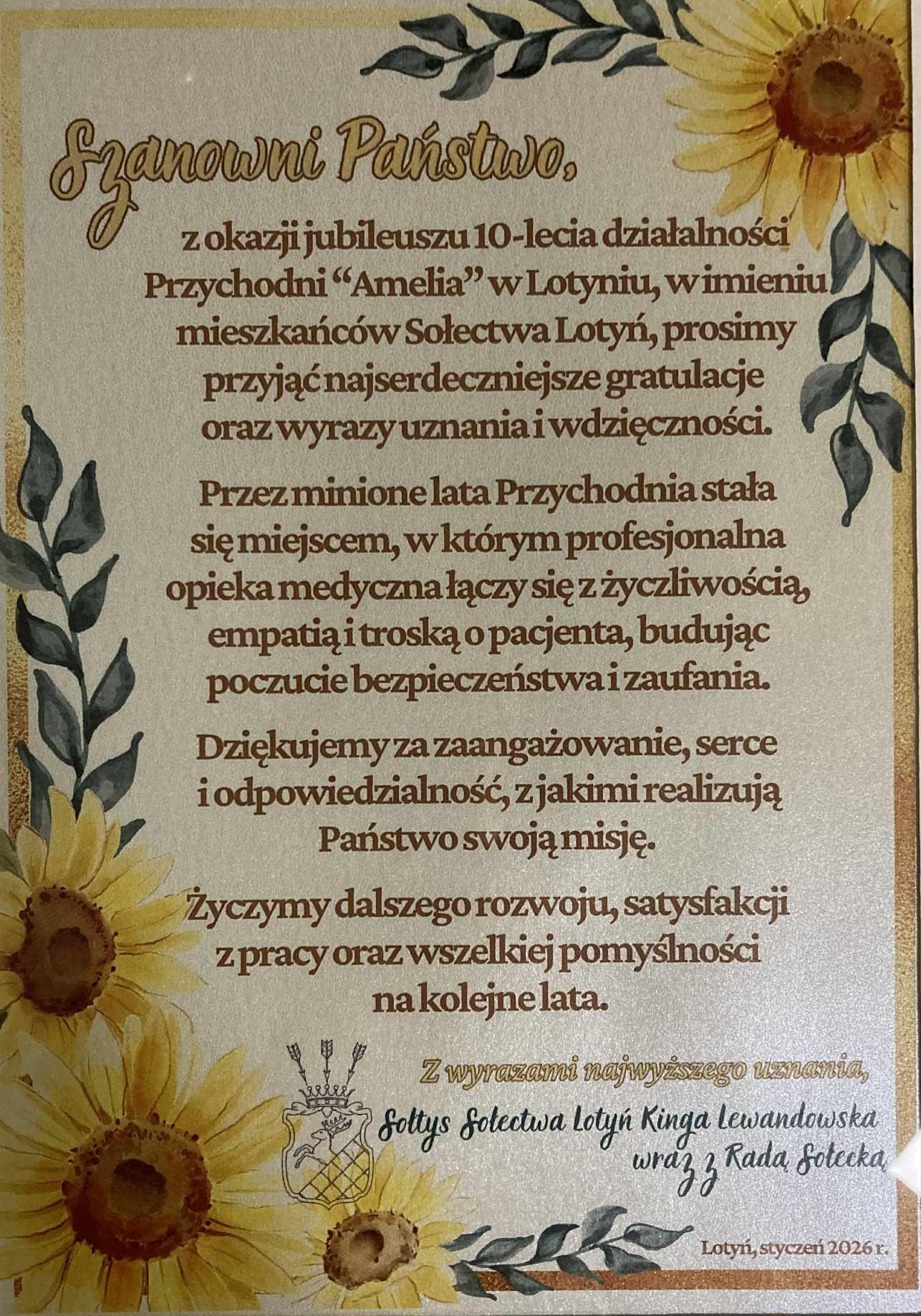Z okazji 10-lecia Przychodni AMELIA otrzymaliśmy serdeczne gratulacje oraz wyrazy uznania od Sołectw: Lotyń, Lubniczka, Drzewice, Kruszka, Brzozówka oraz Borki.