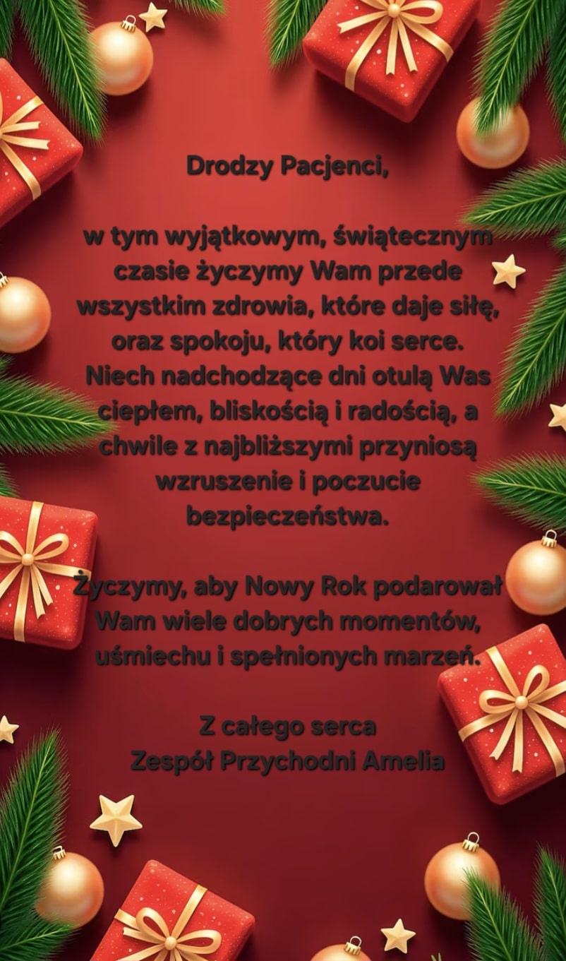Z okazji Świąt Bożego Narodzenia życzymy Wam radości, spokoju i miłości. Niech magiczny czas Świąt przyniesie Wam chwile pełne uśmiechu, serdecznych rozmów i wspólnych spotkań z bliskimi. Obyście odnaleźli w tych dniach prawdziwe piękno prostych, lecz niezapomnianych chwil. Niech Nowy Rok przyniesie Wam zdrowie, spełnienie marzeń i wszelką pomyślność.